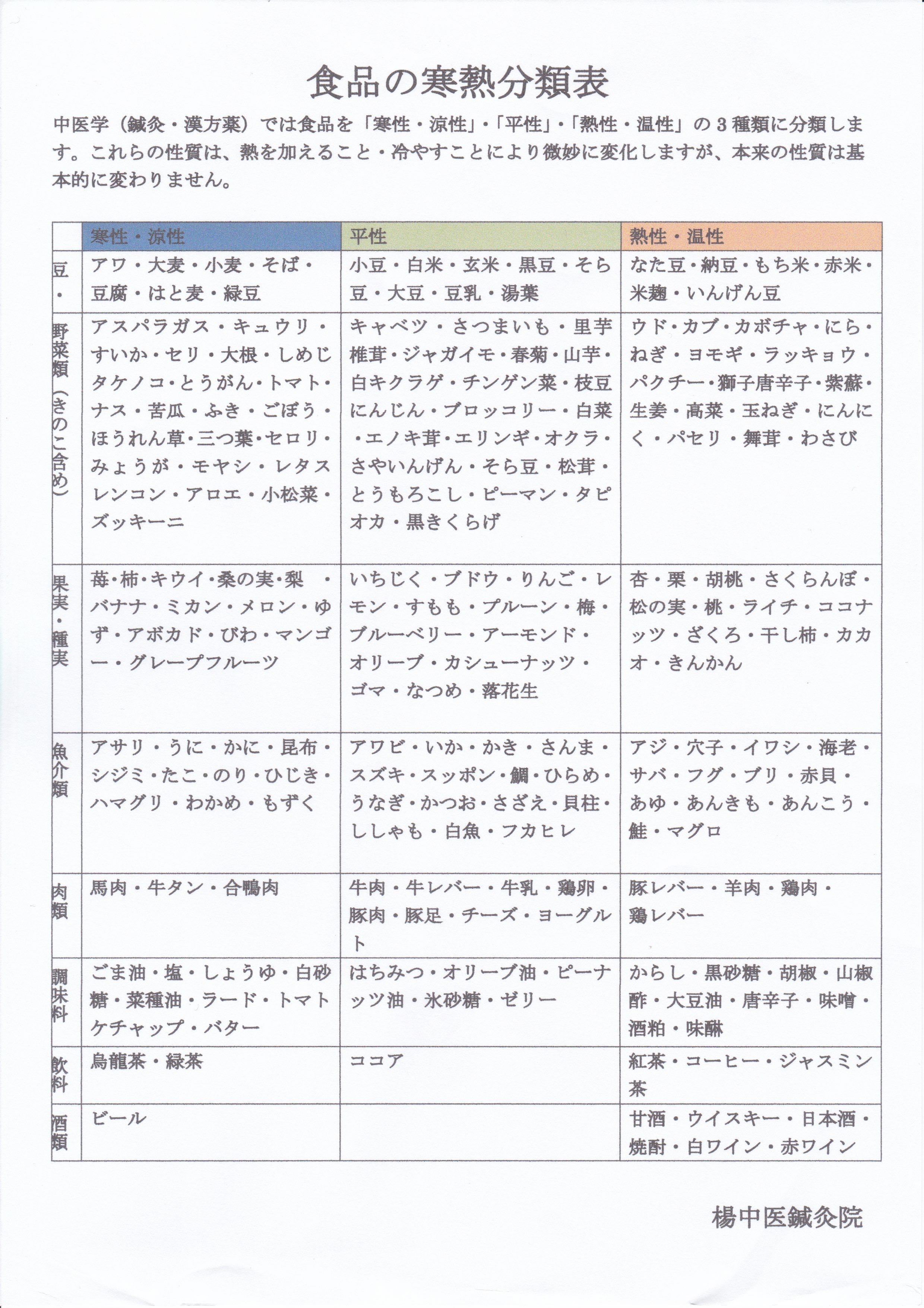 下記の食品の寒熱分類表をご参考にして下さいませ。