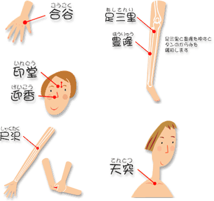 風邪を引いて鼻づまりがある場合は、合谷と印堂というツボを押したり、さすったりすると、鼻の通りが良くなります。