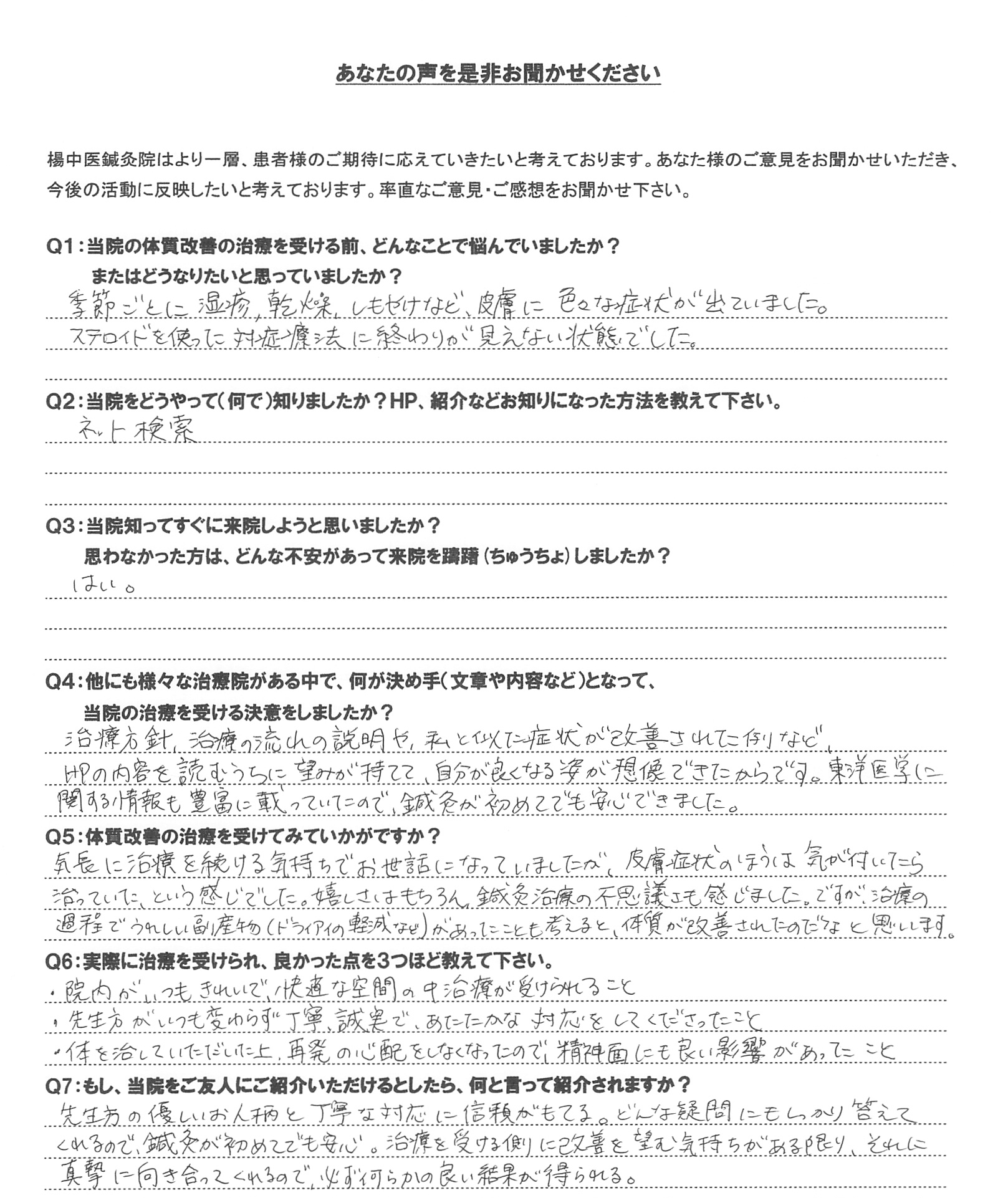 気長に治療を続ける気持ちでお世話になっていましたが、皮膚症状のほうは気が付いたら治っていた、という感じでした。嬉しさはもちろん、鍼灸治療の不思議さも感じました。ですが、治療の過程でうれしい副産物(ドライアイの軽減など)があったことも考えると、体質が改善されたのだなと思います。