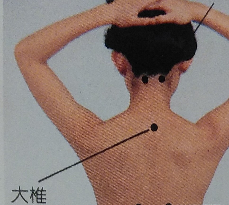 『大椎』は、首の後ろで、首を前に倒したときに、一番出っ張る骨の下のところになります。
