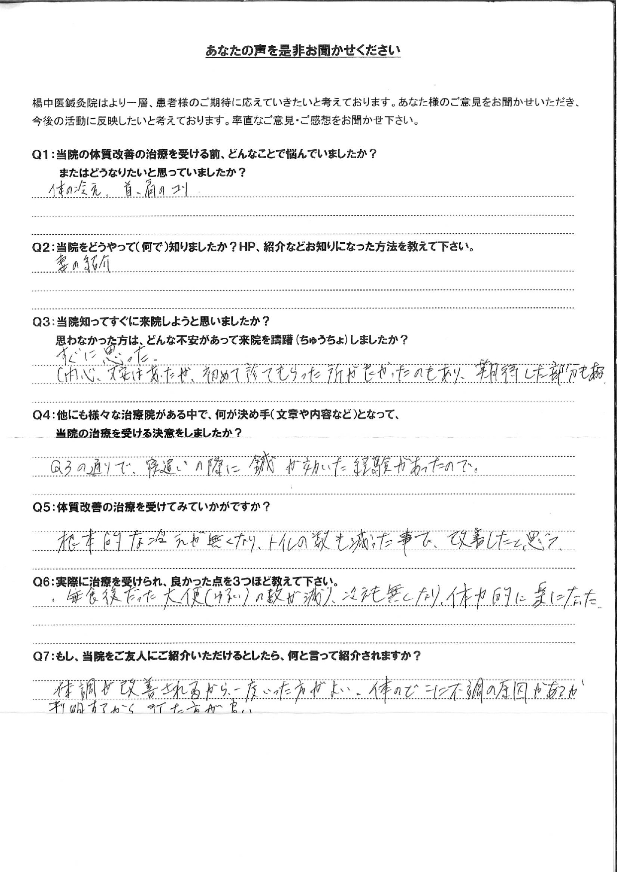 ①肩こり解消 ②便秘解消 ③(先生との会話で)物事を前向きに考えるようになりました。
