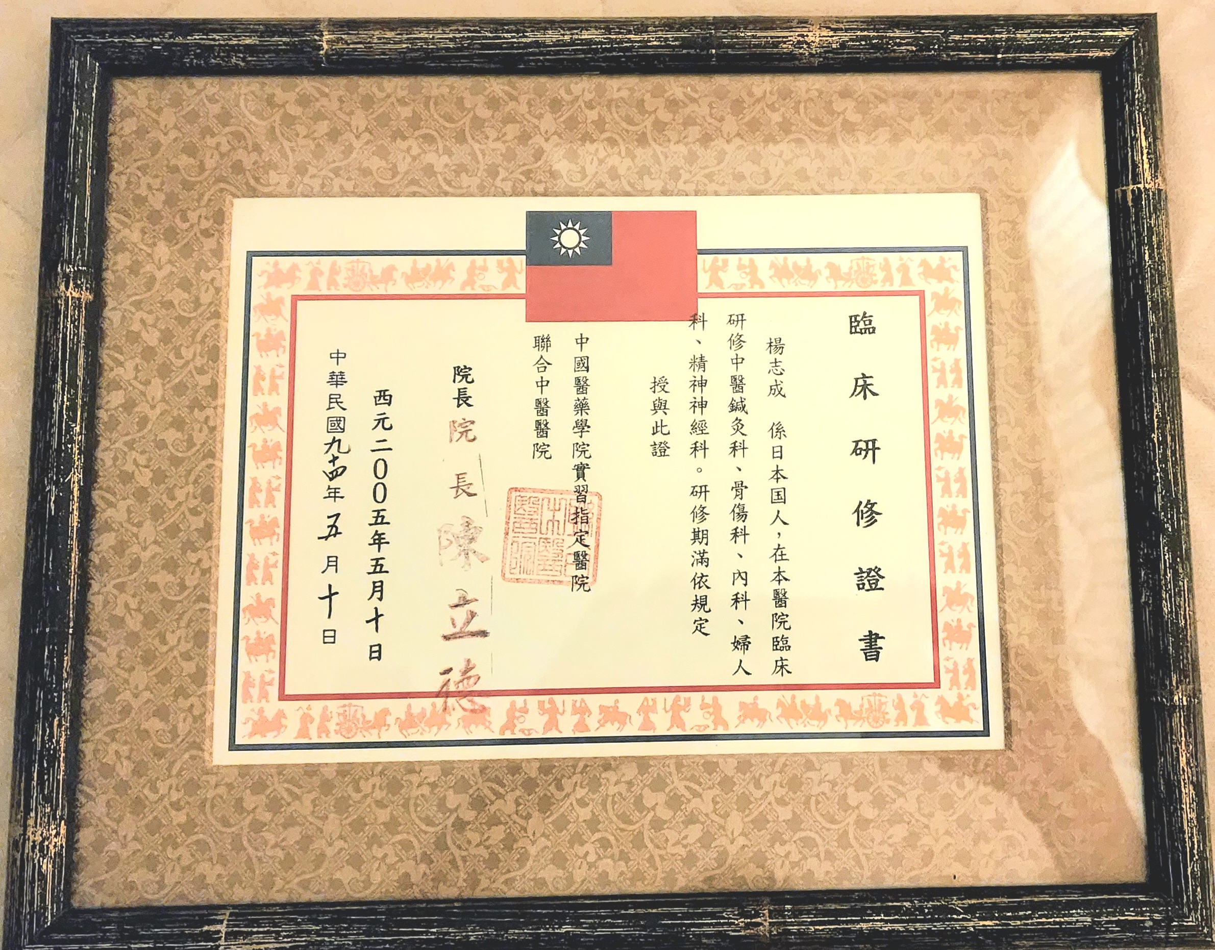 当院の院長 楊 志成は伝統鍼灸の本場台湾で学び、中国医薬大学付属病院で臨床実習を積み、その他上海中医大学病院や世界保険機構臨床研修をも積み、もちろん日本で施術を行うに当たって日本でも就学し日本のライセンスを取得しております。