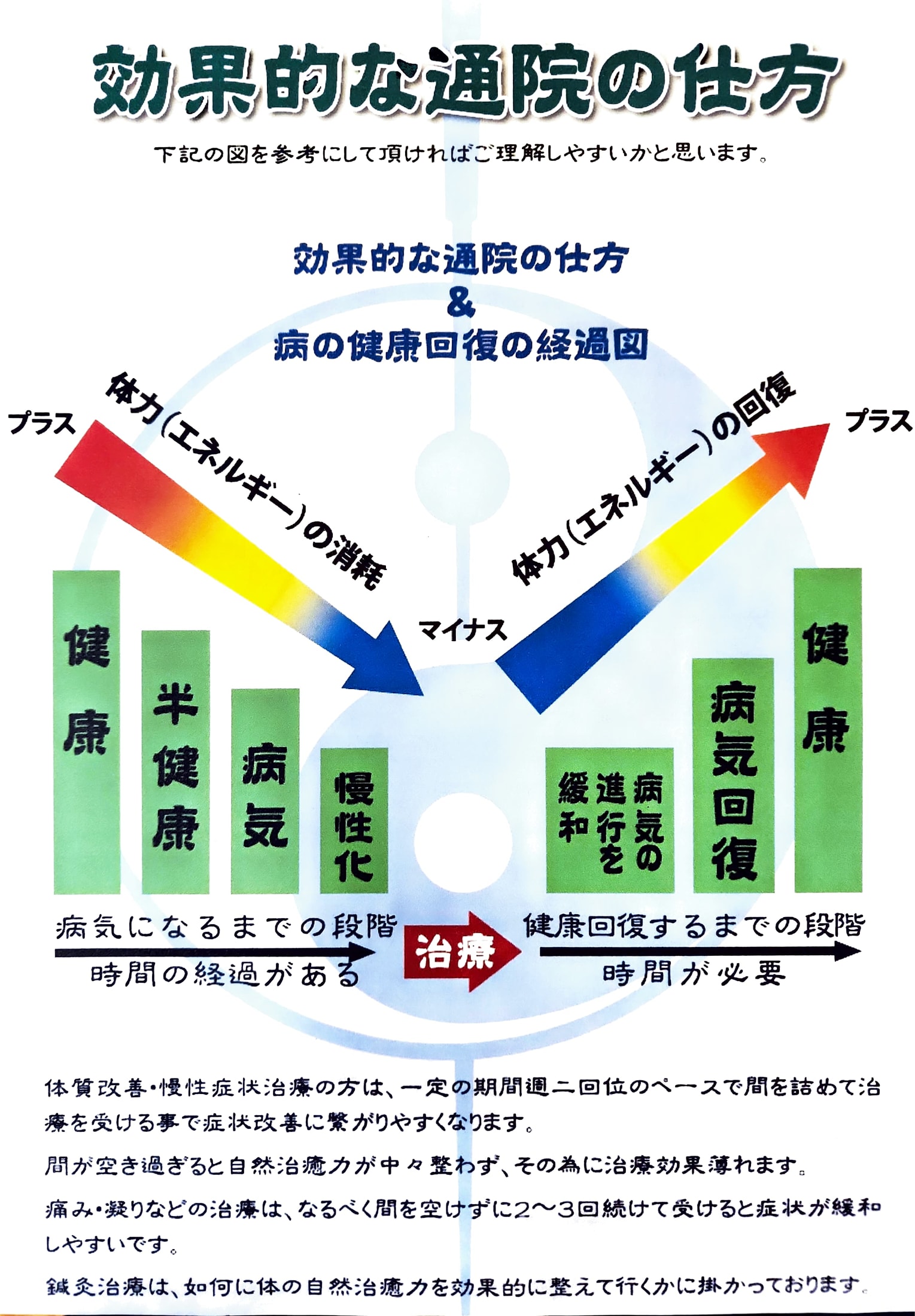 その為体調を回復させるのに、体内エネルギーバランスを早急に取り戻す必要が有ります。それにはなるべく治療の間を開すぎないほうが治療効果が高まりやすいです。
