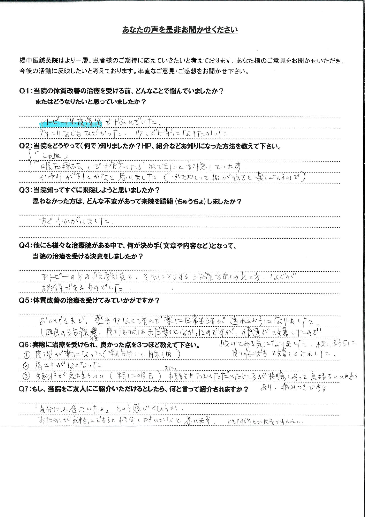 おかげさまで、薬も少なく済んで楽に日常生活が送れるようになりました。1回目の治療後、皮フ症状はまだ変化なかったのですが、便通が改善したので続けてみる気になりました。続けるうちに皮フ症状も改善してきました。
