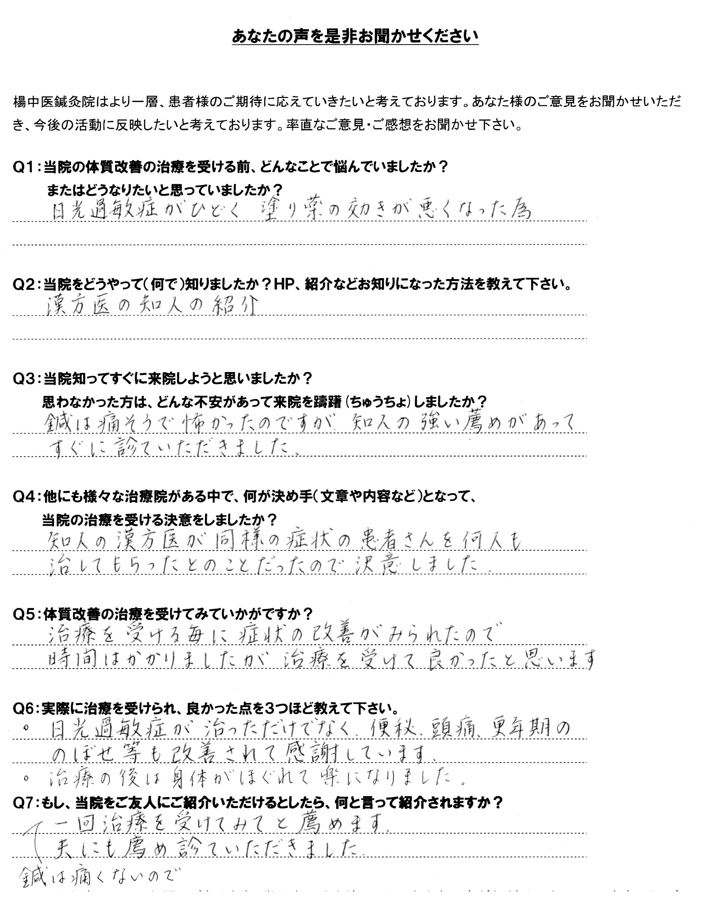 ・日光過敏症が治っただけでなく、便秘、頭痛、更年期ののぼせ等も改善されて感謝しています。